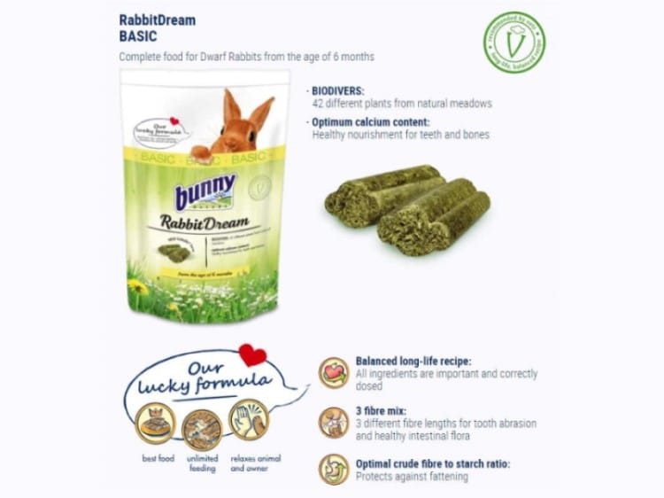 Bunny Nature RabbitDream BASIC pellets til kanin er specielt tilpasset til kaniner fra 6 måneder gamle, både når det kommer til optimal størrelse og sammensætning med fokus på at opfylde din kanins ernæringsmæssige behov og er balanceret langtidsformel, hvor alle komponenter er vigtige og korrekt doseret.