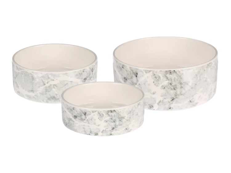 Flamingo Marmi Foder og vandskål med udsenet af Marmor-looket er super trendy og stilrent. skålen vil næsten altid passe ind i hjemmet med det stilrene udsende .