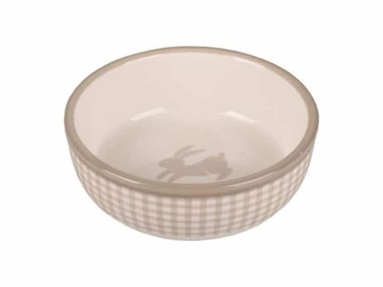 Keramik skål fra Flamingo som er egnet til kaniner og gnavere. Skålen er hvid med motiver inde i og udenpå er den ternet beige og hvid. Skålen er stilet i en lækker farve, som passer ind i alle hjem