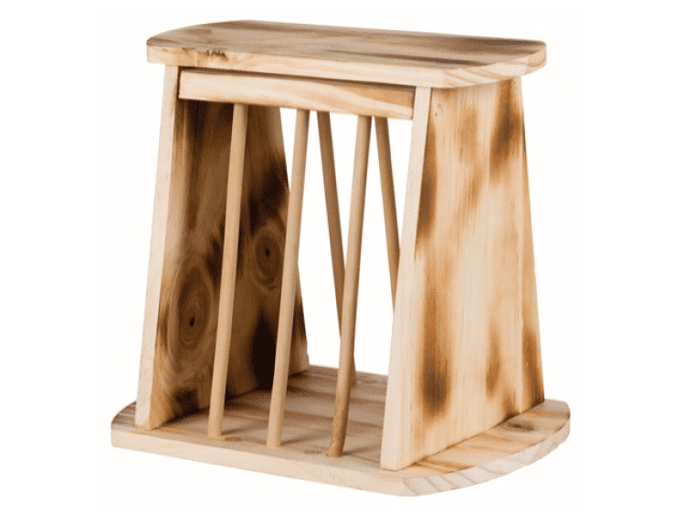 Trixie Høhæk “Stor” med låg i flammet træ. Påfyldning med hø, græs o. lign. Med låg som har vippe funktion. Ingen risiko for skader. Beskytter mad mod urin og ekskrementer.
