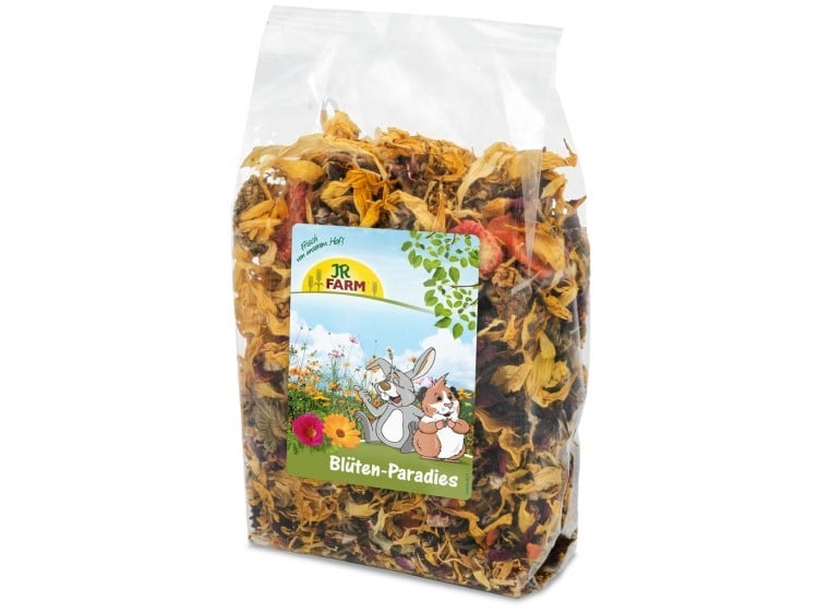En farverig blanding af udsøgte kronblade tager din kanin til blomsterparadiset. Lad din kanin fordybe sig i den farverige verden af denne vidunderligt duftende blomsterblanding og giv dem en sand fest for sanserne. Afslappende rosenblomster, beroligende og anti-inflammatoriske morgenfruer samt C-vitaminrige og immuniserende hibiscusblomster møder hostelindrende solsikkeblomster. Blomsterparadiset er raffineret med beta-caroten og fiberholdige gulerødder og frugtige jordbær rige på vitale stoffer. Denne smarte blanding er den perfekte måde at give en ekstra dosis kærlighed og samtidig booste deres vitalitet.