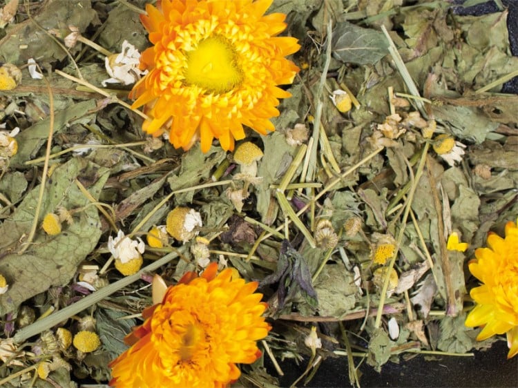 Mælkebøtte 87%, kamille 5%, pebermynte, kornblomster 3%