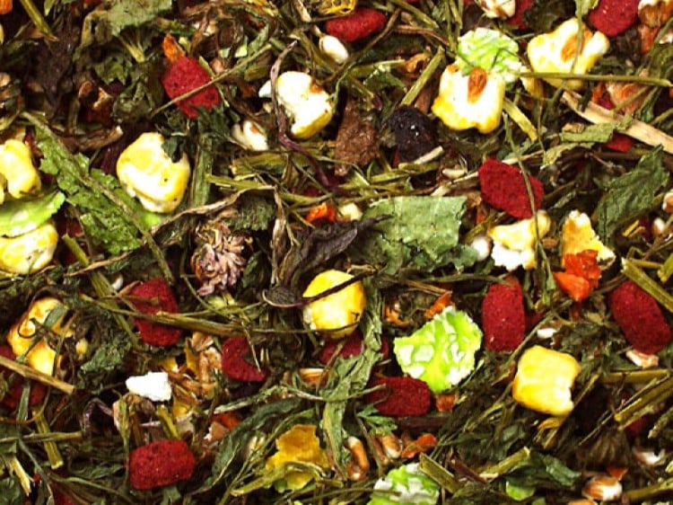 | Sammensætning: | Havreflager, hvedeflager, ærteflager, ekstruderet majsmel, gulerødder, rødbeder, persille, hvede, puffet hvede, lucerne, puffed corn, citronmelisse, johannesbrød, corn flakes, mælkebøtte 3%, solhat, pebermynte, bjergmelisse blomster 1%, rødkløver 0,5% |
