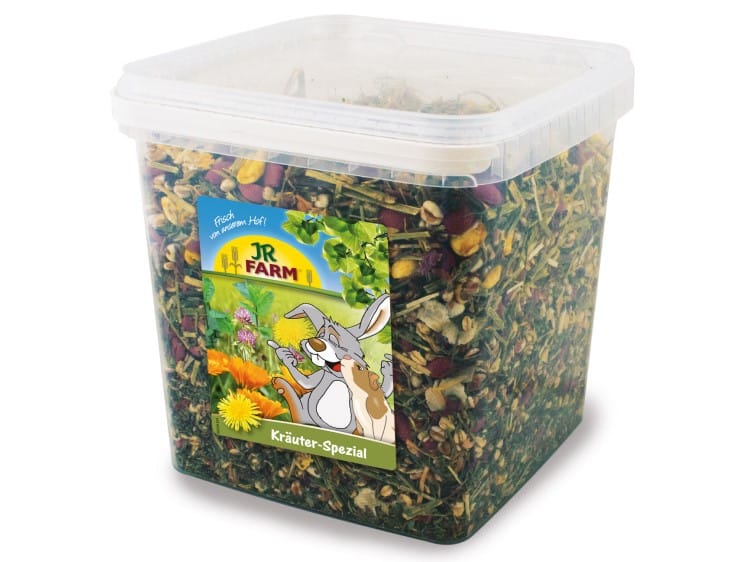 JR Farm Urter Plus i spand er fyldt med naturlige og tørrede urter, grøntsager mm. Denne her lækre blanding indeholder havreflager, hvedeflager, ærteflager, ekstruderet majsmel, gulerødder, rødbeder, persille, hvede, puffet hvede, lucerne, pustet majs, citronmelisse, johannesbrød, majsflager, mælkebøtte, solsikke, pebermynte, hø af bjergeng, morgenfrueblomster, rødkløver.