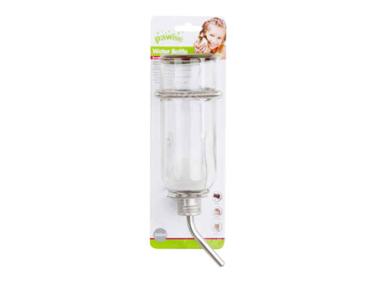 Drikkeflaske i glas fra Pawise med metallåg og metal sugerør hvilket gør flasken bidesikker og man kan nemt følge med i vandstanden, da den er gennemsigtig. Fastgøres med fjeder og ståltråd. Flasken er med kugleventil som gør den egnet til kaniner.