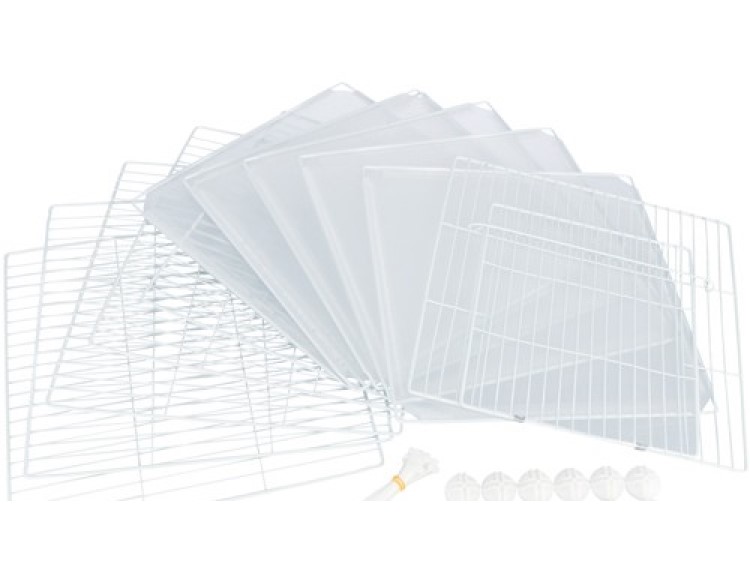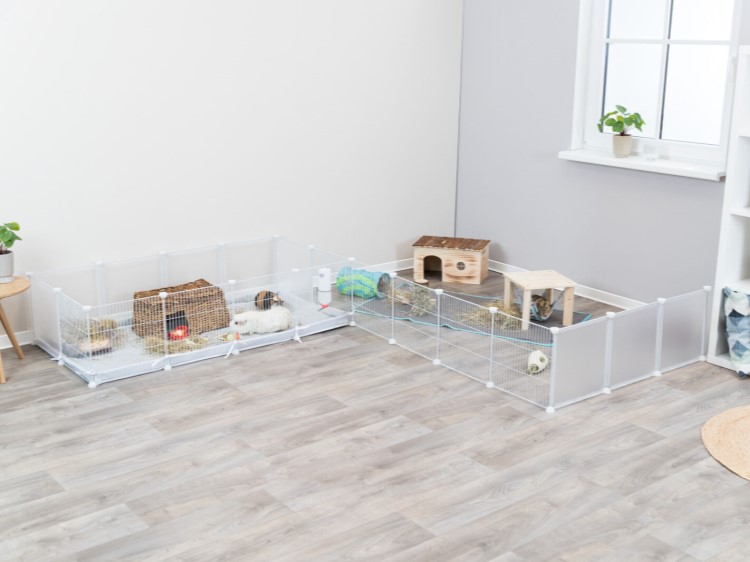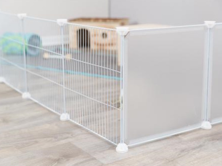Indhegningen består af 12 elementer, der måler 35 x 35 cm. 6 af disse er med gitter lavet af metal (en har en låge), så din kanin nemt kan komme ud og udforske resten af hjemmet når du er hjemme uden at skulle løftes over kanten, de 6 stykker i pakken er lavet af matteret plast med metalramme som kan være mod vægen så de ikke gnaver eller kradser i vægen eller mod andet de ikke må kradse i. Flere indhegninger kan sættes sammen og udvides efter ønske. Hvis du har store frikaniner anbefaler vi at man sætter en ekstra indhegning, så de får mere plads.